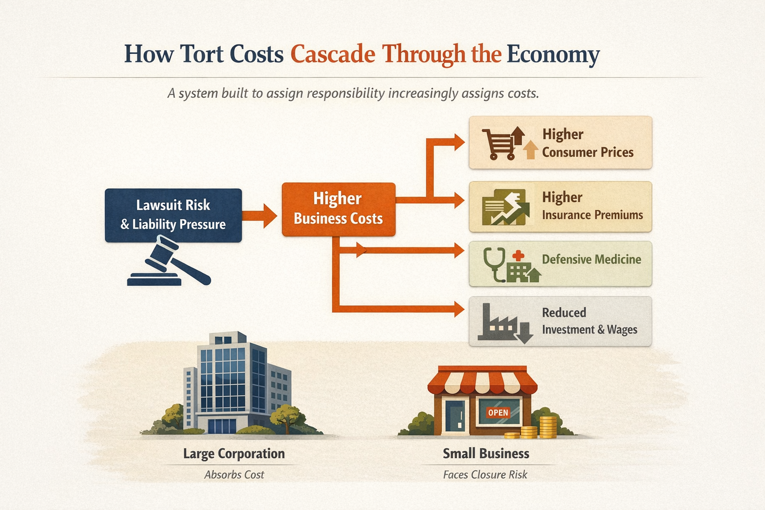 We tend to picture “corporations” as the natural targets and victims of tort excess. But this misses a crucial point: proportionally, small business is often the bigger loser. Large firms can absorb lawsuits as a cost of doing business. Small firms cannot. Many suits are filed not because the plaintiff expects to win at trial, but because the mere cost of defense is enough to force settlement. That is not civil justice; it is gaming the legal system.